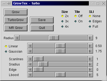 GrowTex Linux version 000717-2340 Linear TurboGrow radius=13, Lparam=0.40 size=2x, tile=on, SLI=edges scanlines=1, sradius=2 edge=14, lboost=5 Synthesis time: 78s |