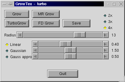 GrowTex Win32 version 000628-2350 Linear TurboGrow radius=13, Lparam=0.70 Synthesis time: 77s internal parameters: SCANLINES=1 SRADIUS=2 |